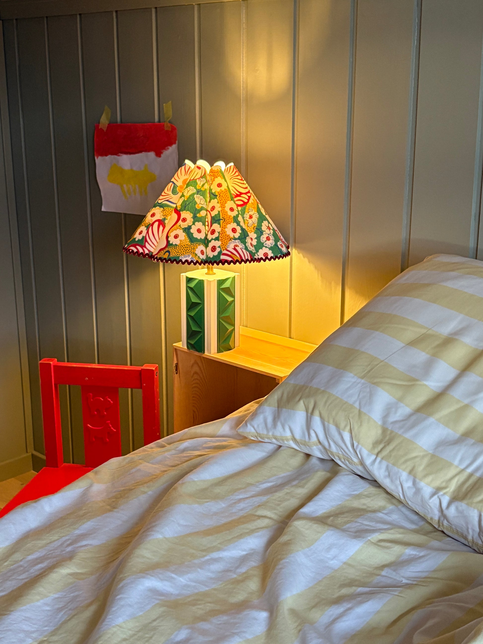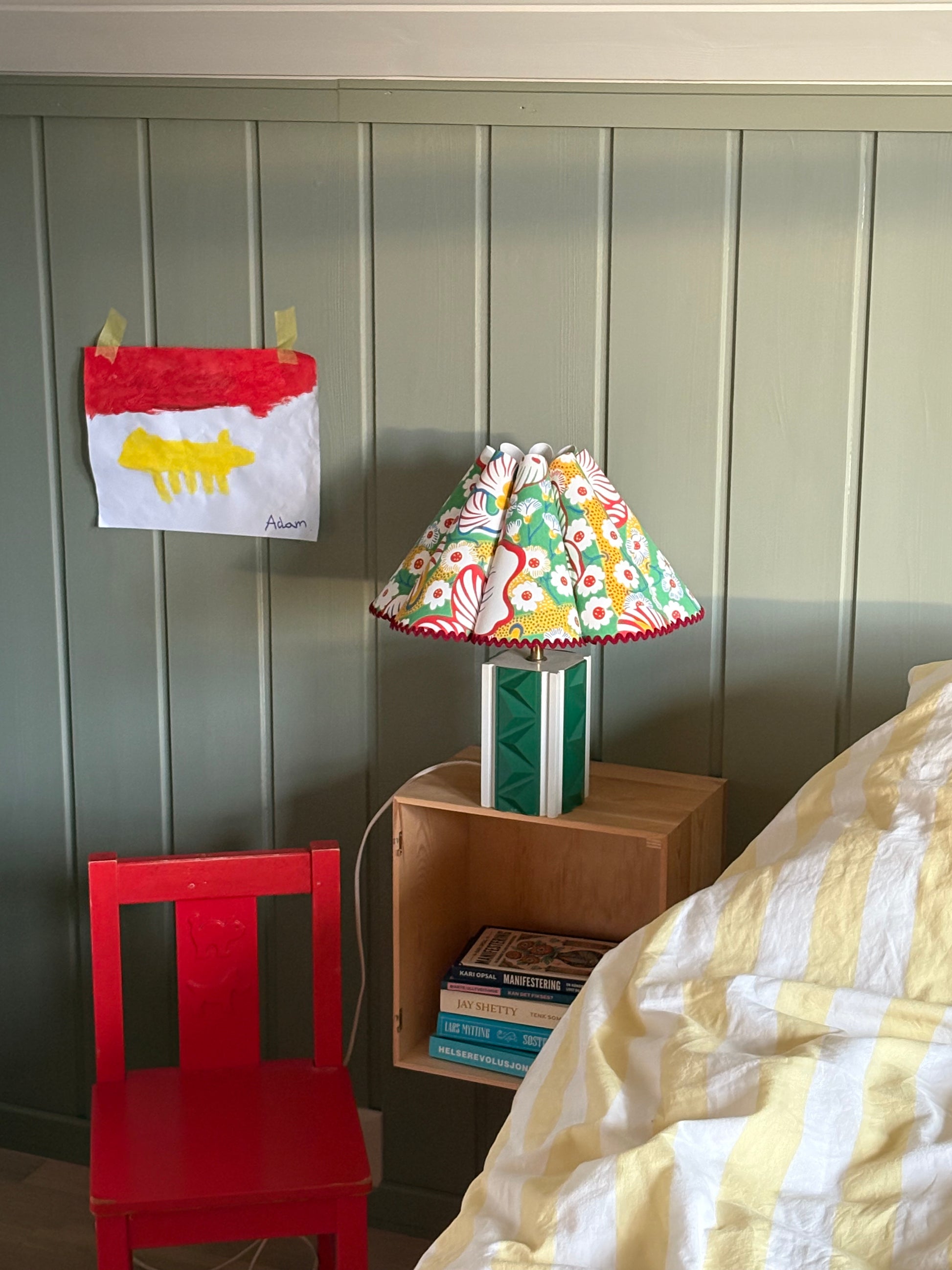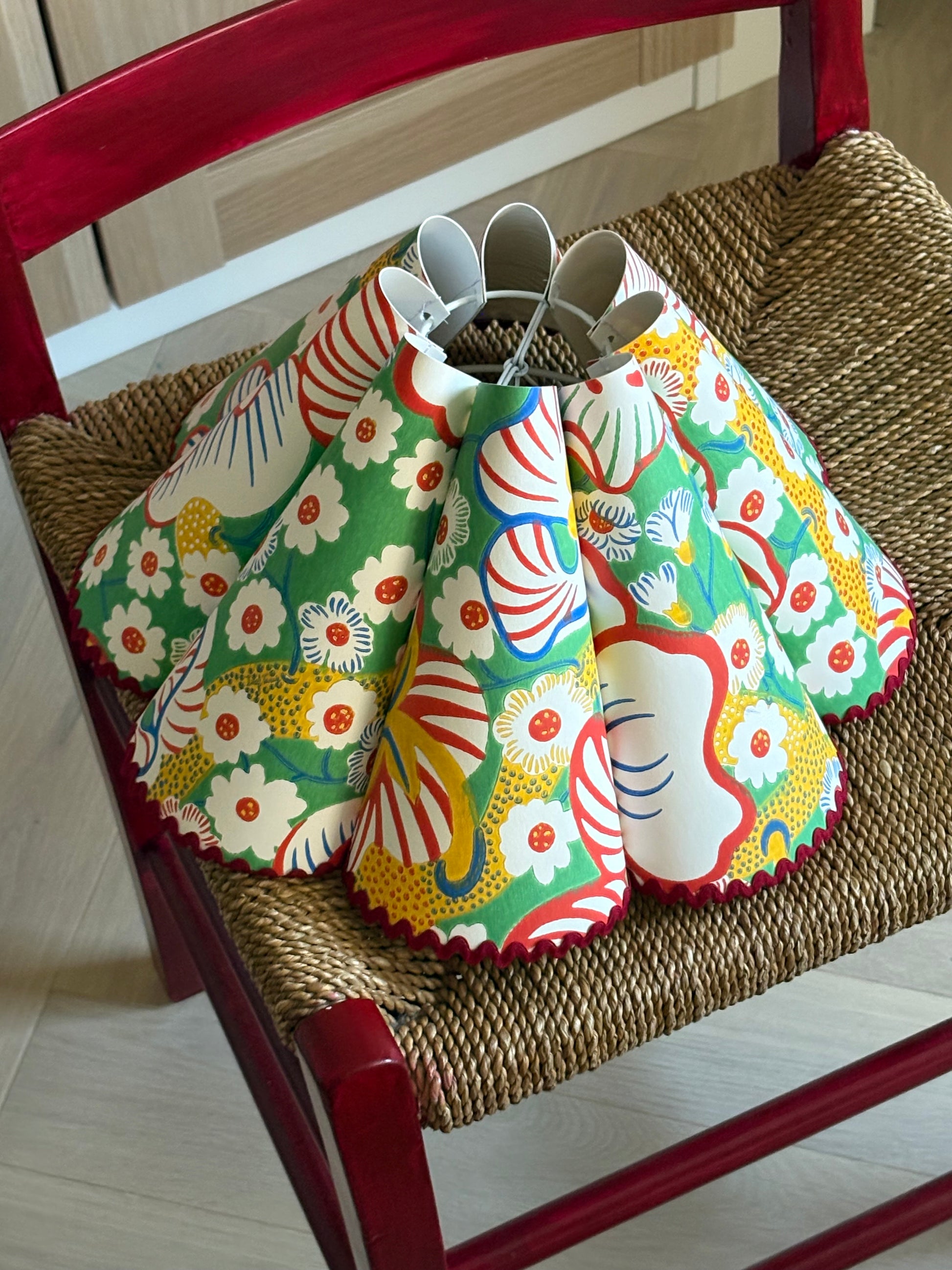 Nydelig bølgeskjerm laget med tapet fra Svenskt Tenn. Tapeten heter Eldblomman og er en av mine favoritter. Her i en nydelig mix av grønn, blå, gul og rød.