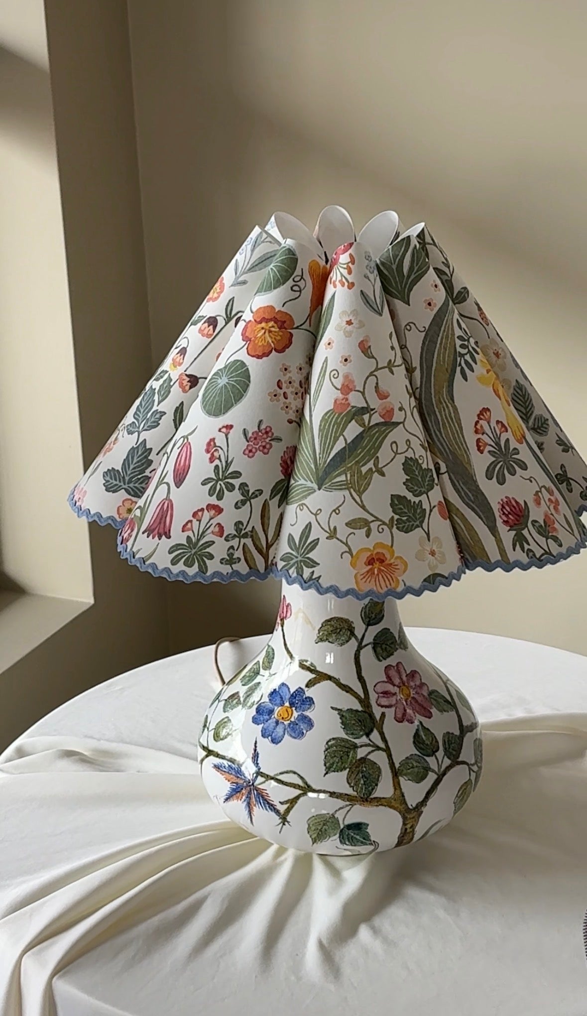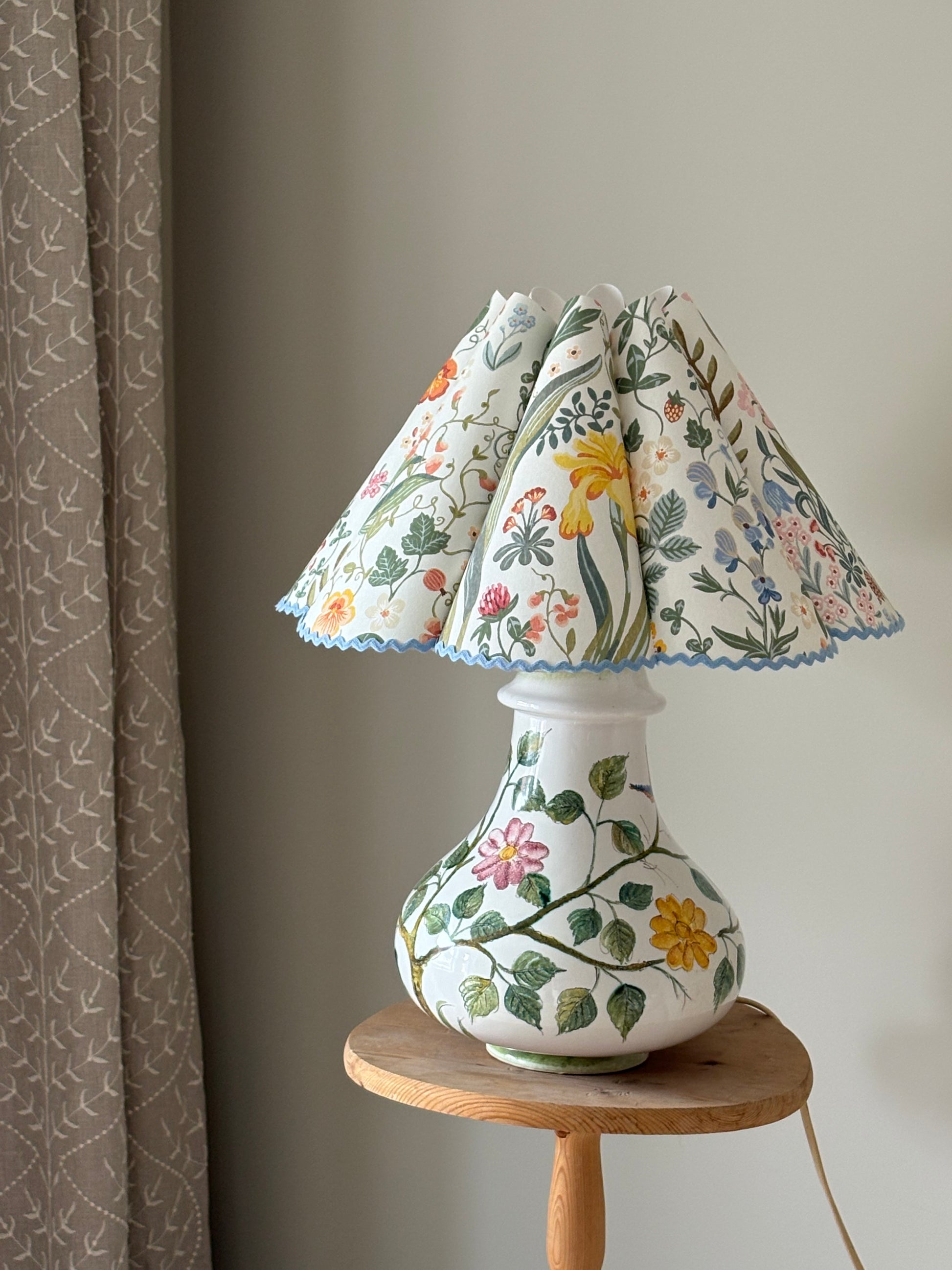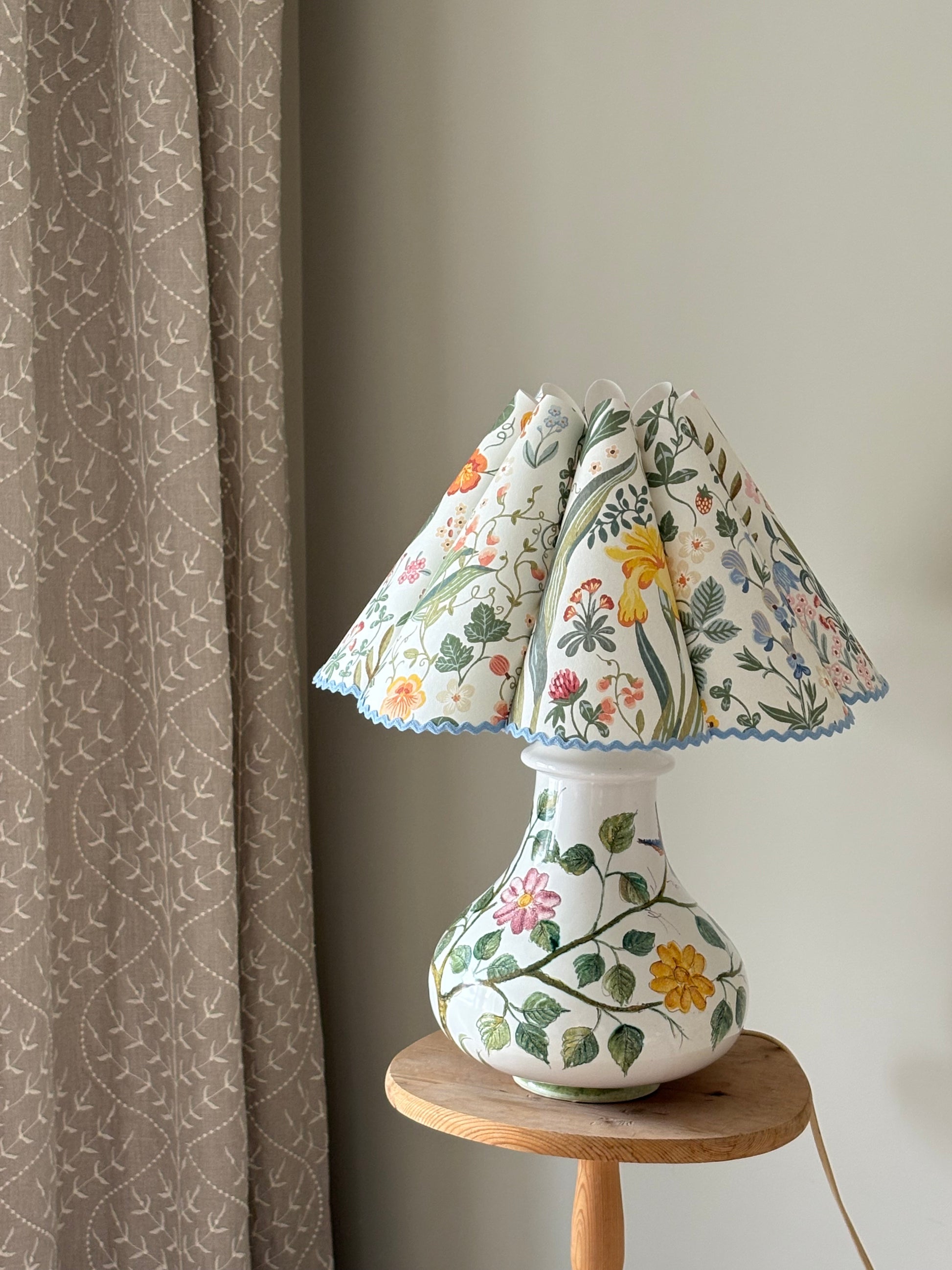 Lampeskjermen er håndlaget og ujevnheter kan fremkomme. Mønsteret i skjermene vil variere fra skjerm til skjerm ettersom hvor jeg jobber på tapeten. 🌷 Laget med tapet fra Borås. Stativet kommer fra en liten fabrikk i Danmark.
