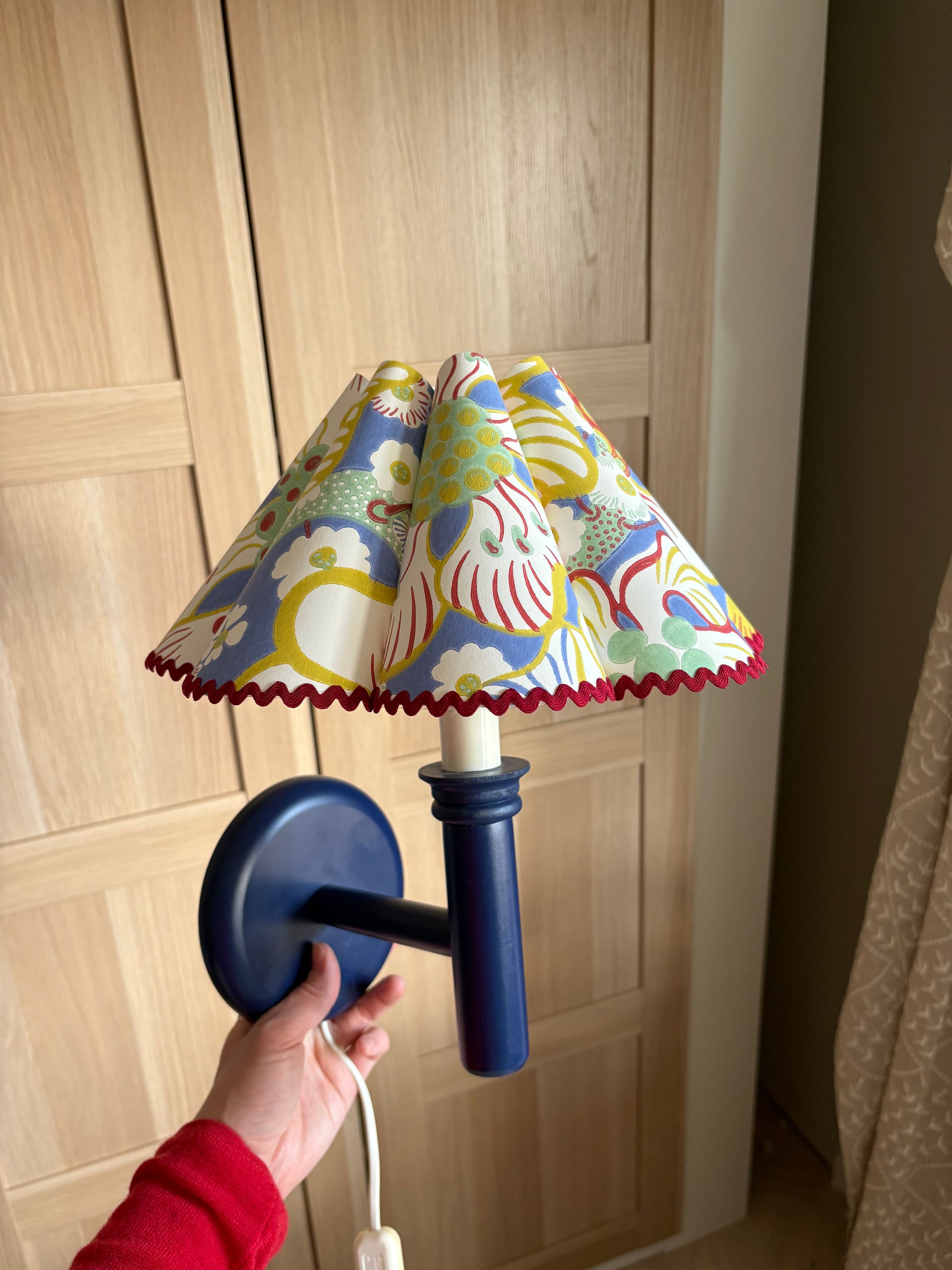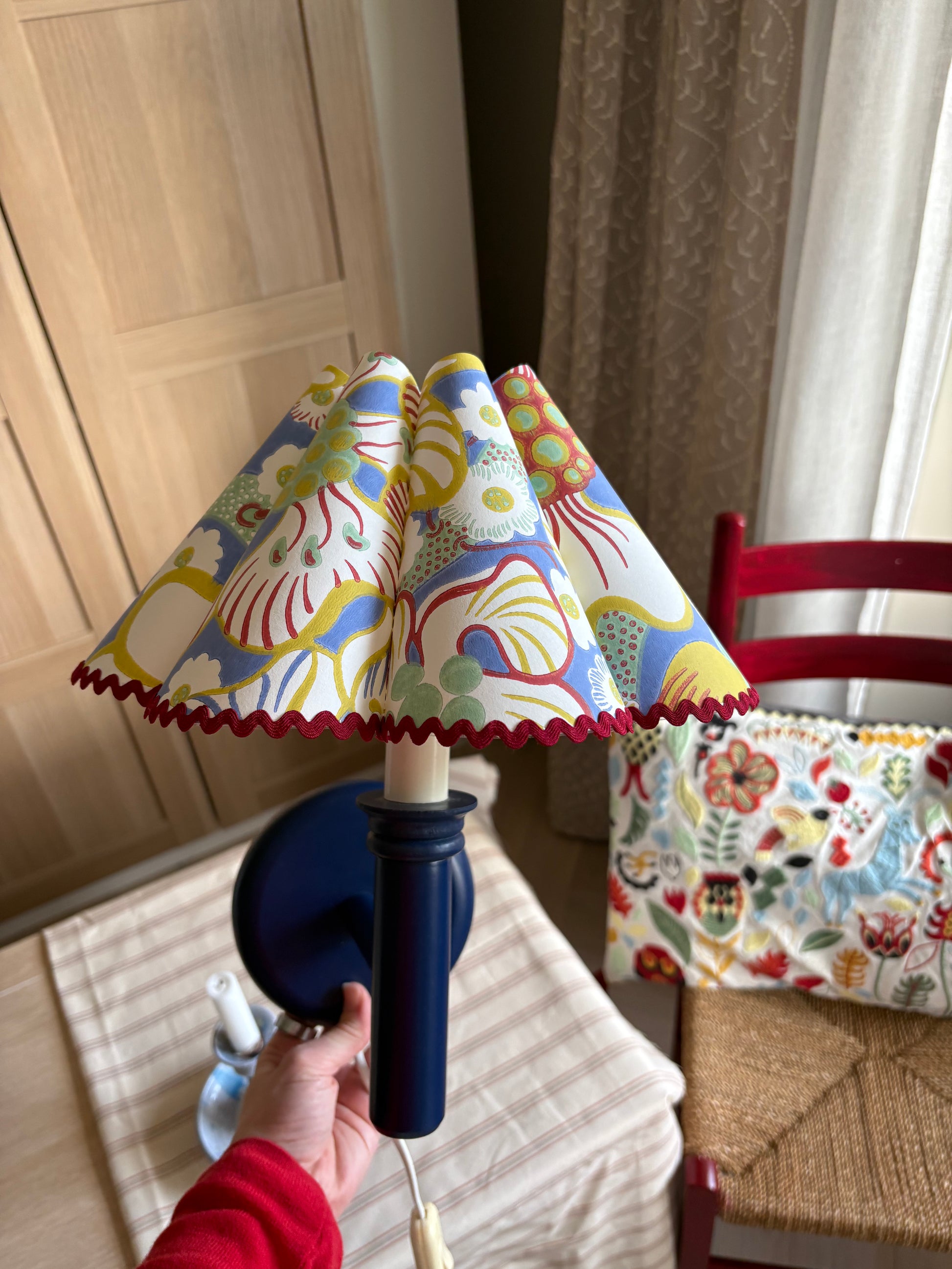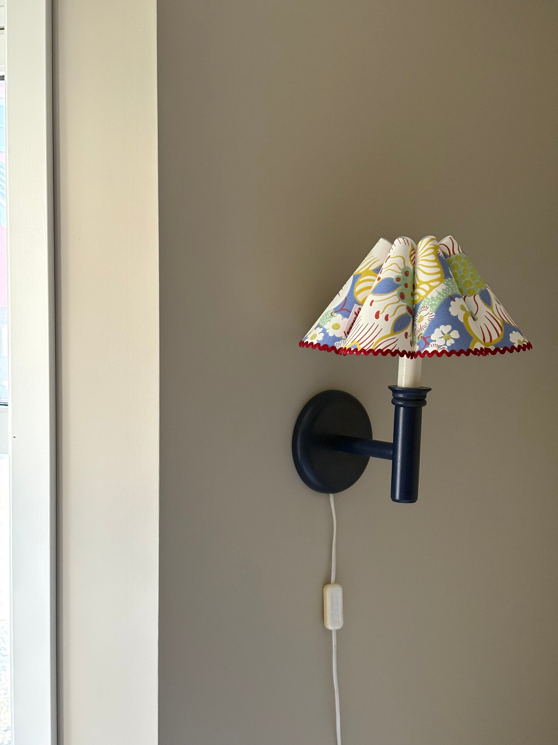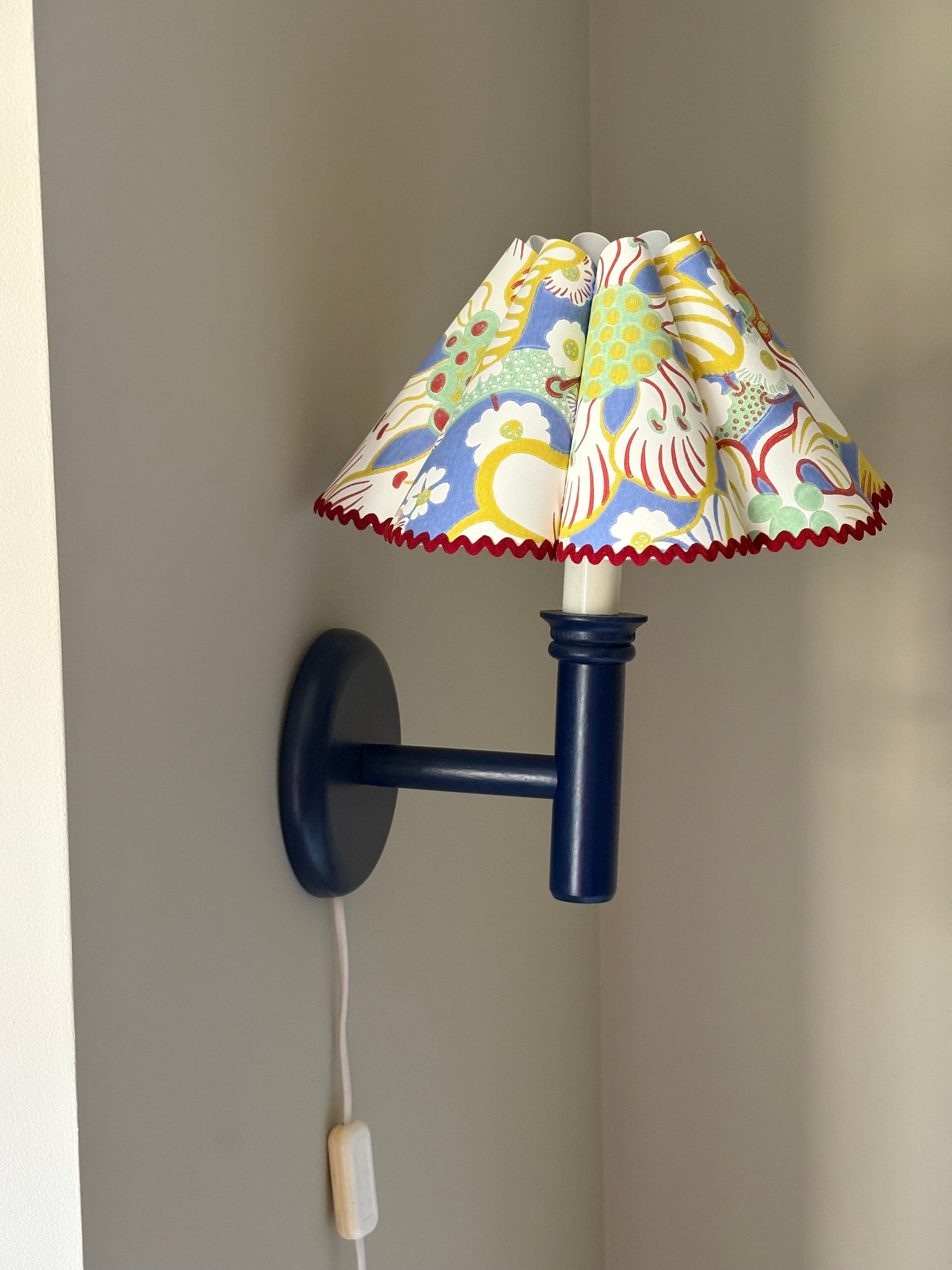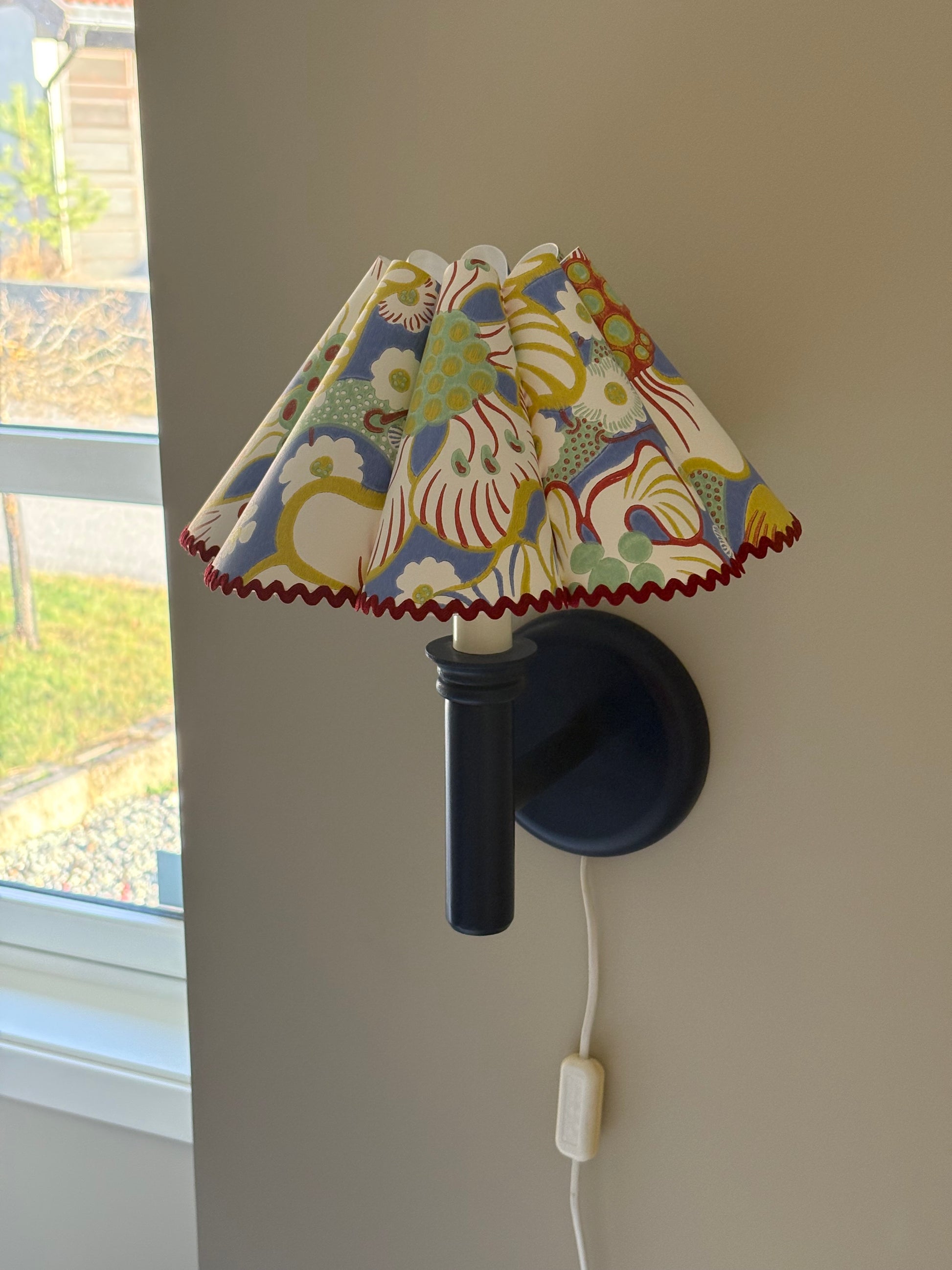 Blåmalt trelampe til vegg med en nydelig bølgeskjerm lampet av en av mine favoritt tapeter; Eldblomman, Josef Frank, Svenskt Tenn.