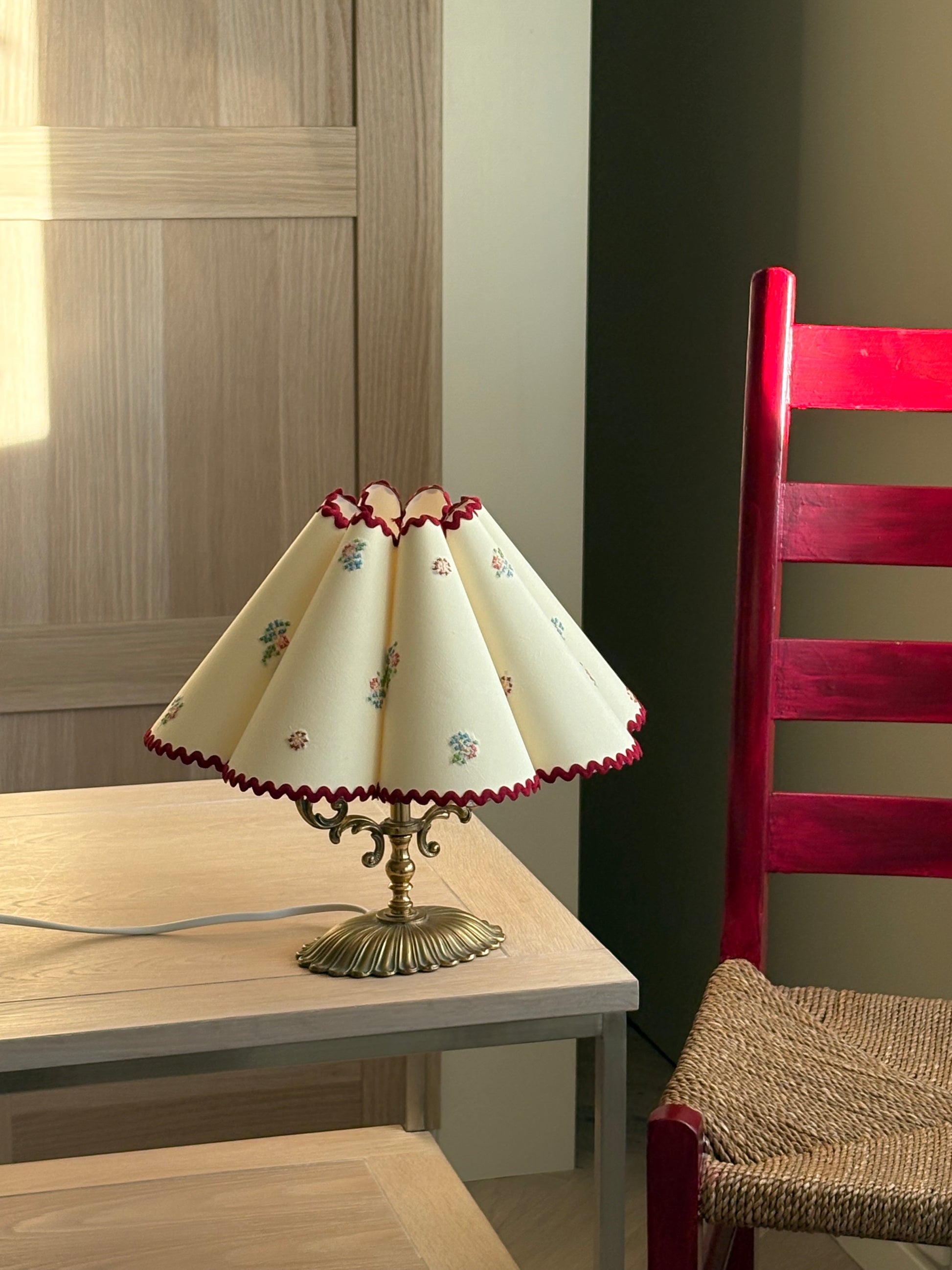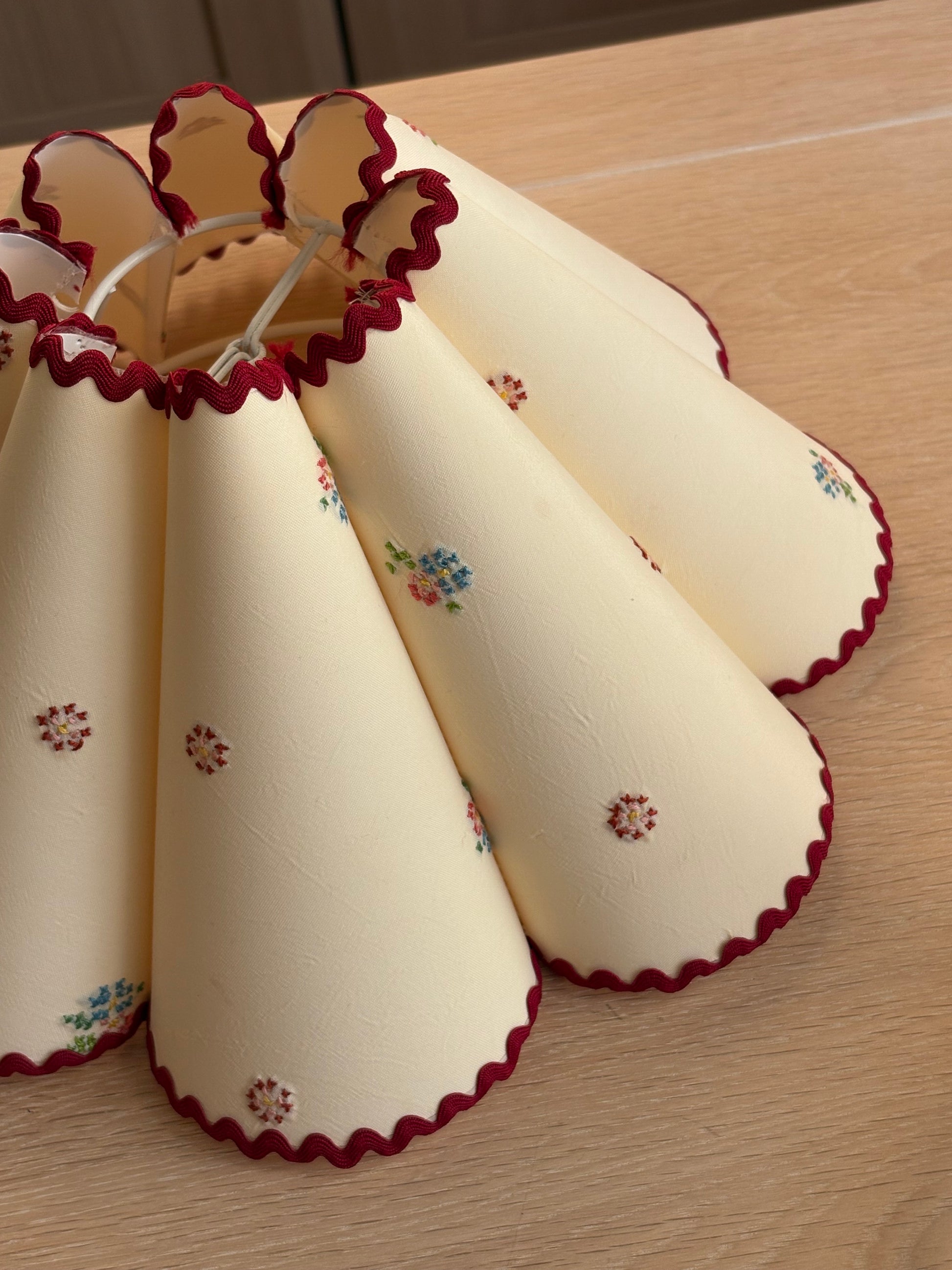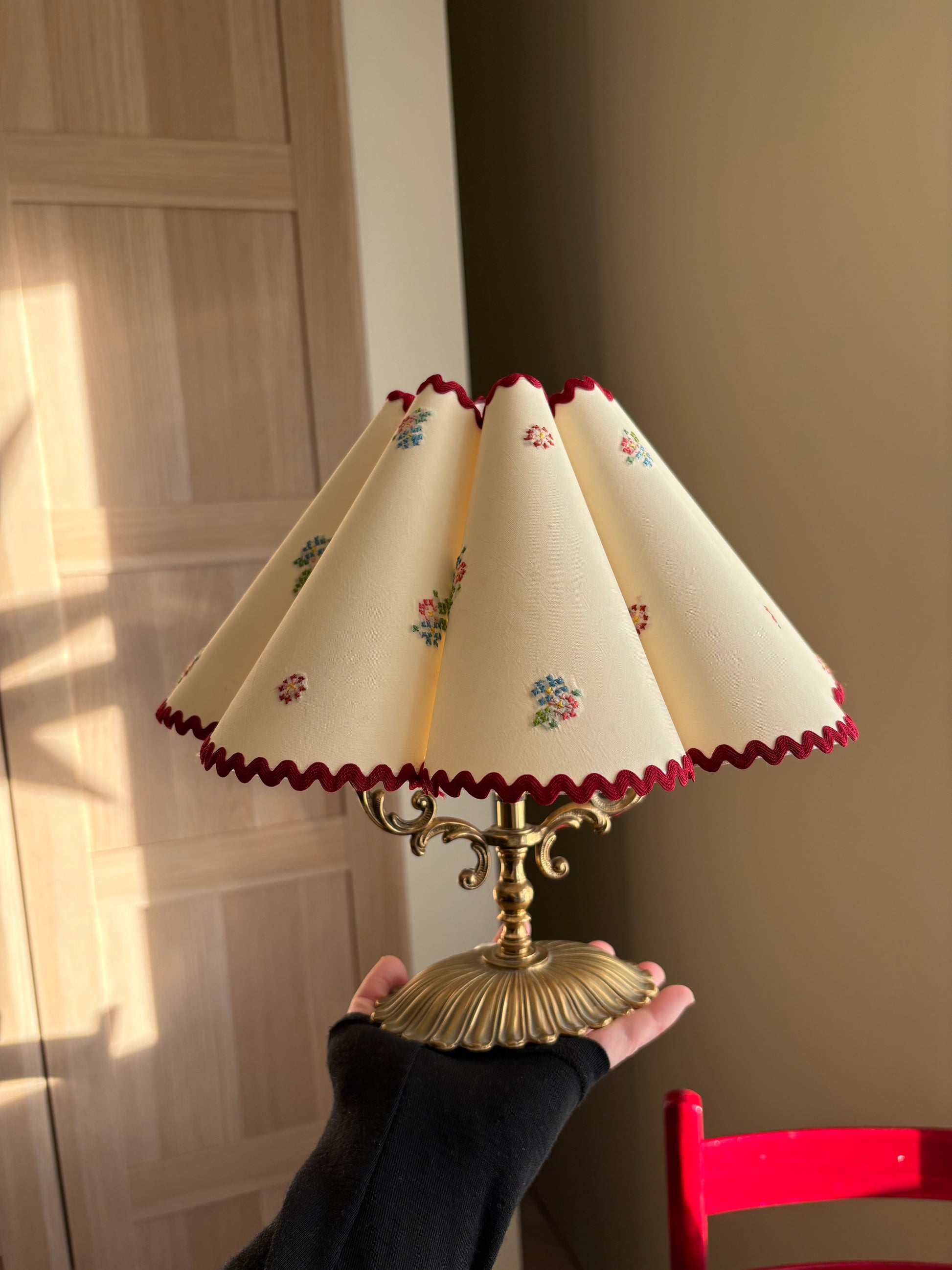 Brodert duk med fine blomsterdetaljer. Lampeskjermen kan ha ujevnheter da det er håndlaget. Stativet er nytt fra en liten fabrikk i Danmark.