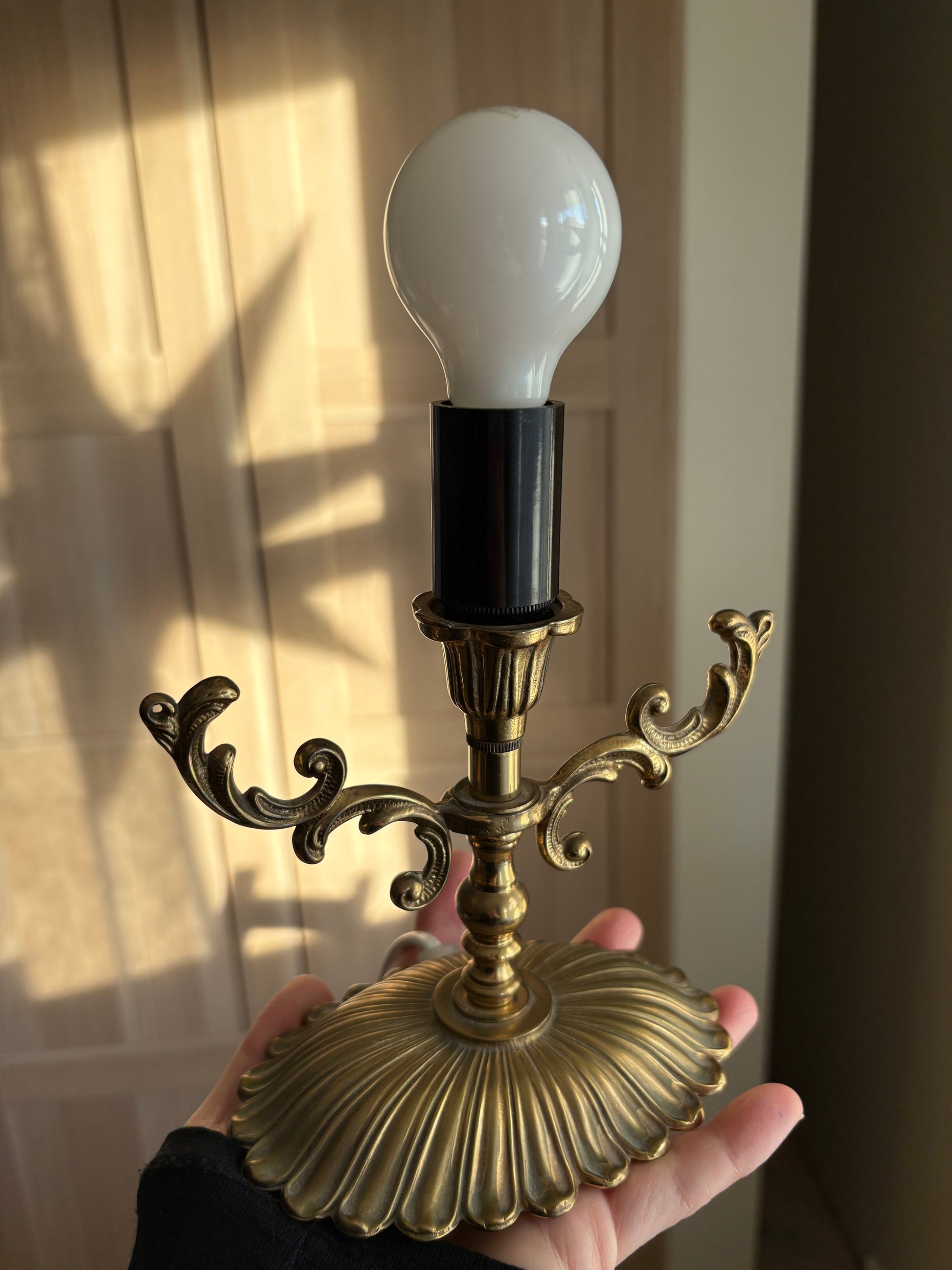 Vil du redde denne lampen? Nydelig vintage messinglampe med masse fine detaljer. Den har fått ny ledning, bryter og støpsel. Kommer sammen med en fantastisk lampeskjerm av en brodert duk. 🎀🥹