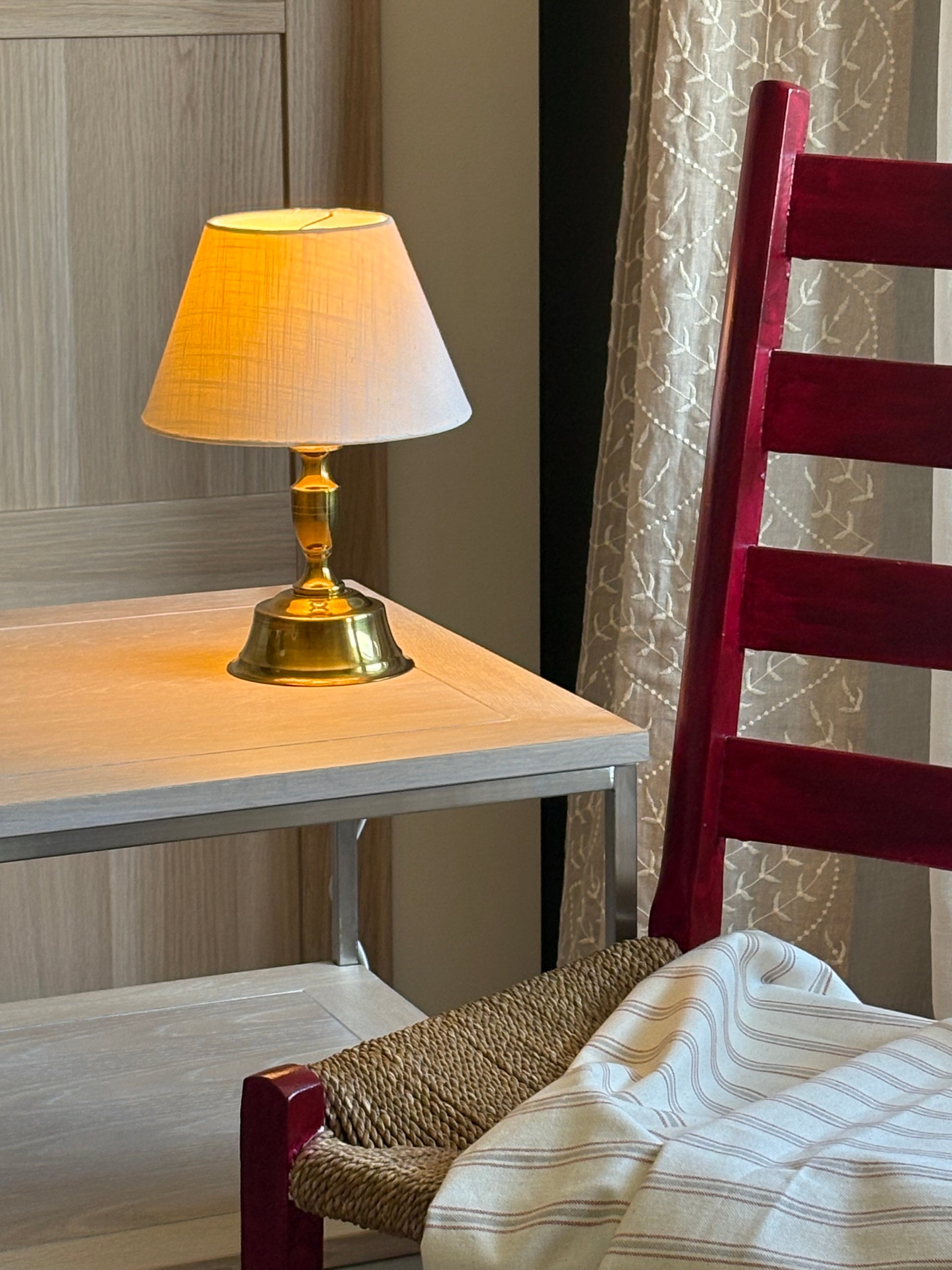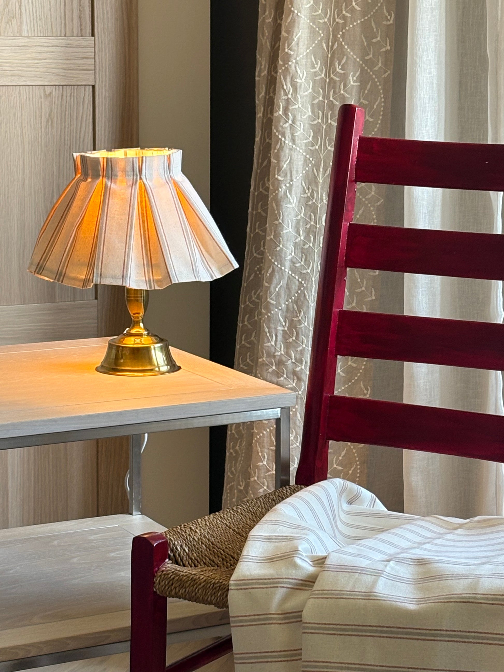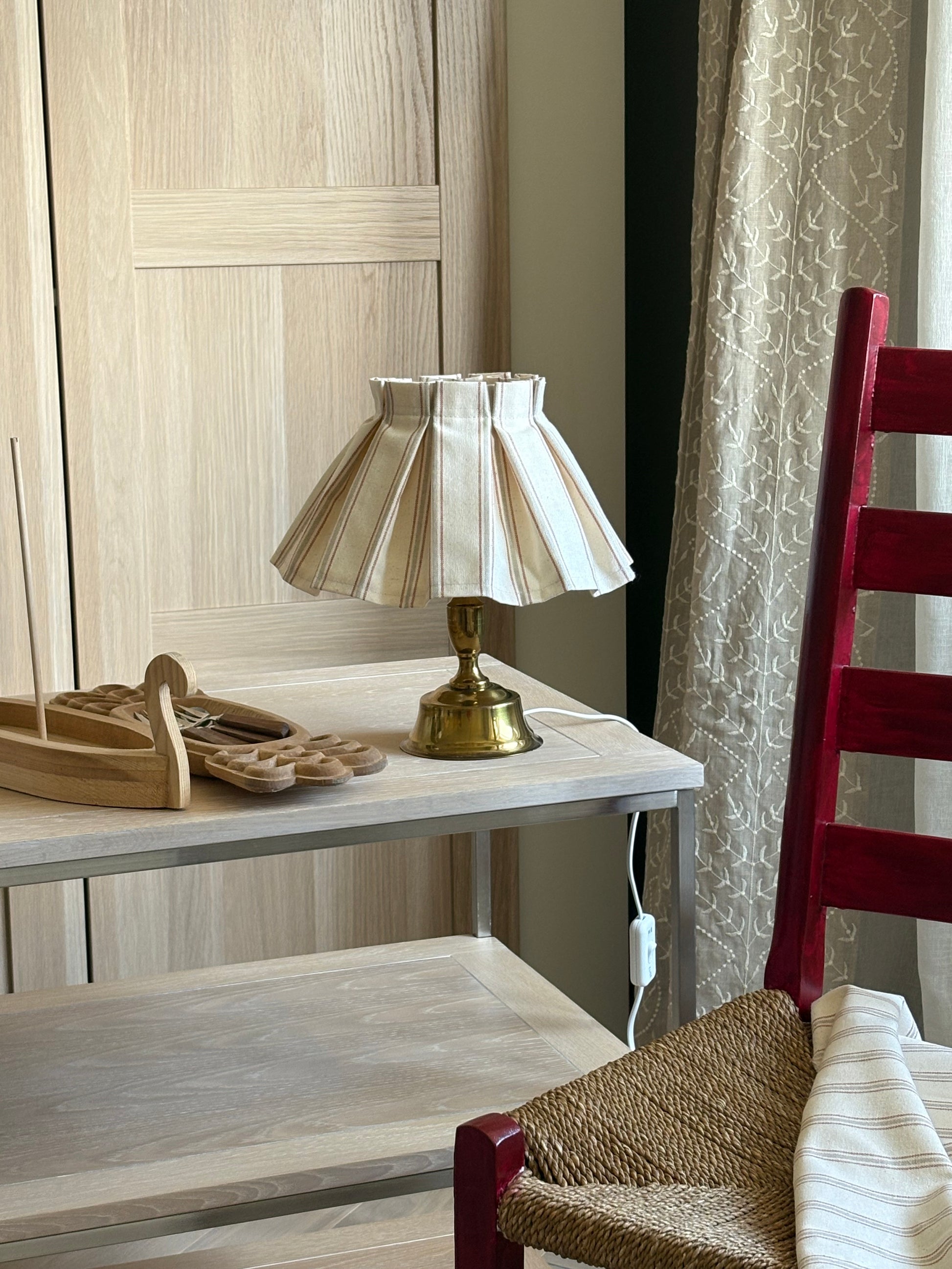 Velkommen inn i sortimentet Vesle cottage. Jeg har lenge vært hekta på cottage core, og denne skjørteskjermen er endelig realisert! Her har du en nydelig antikk messinglampe som har blitt reparert med alt nytt elektrisk, med et nydelig skjørt av en skjerm som Vesle har sydd selv i studio.
