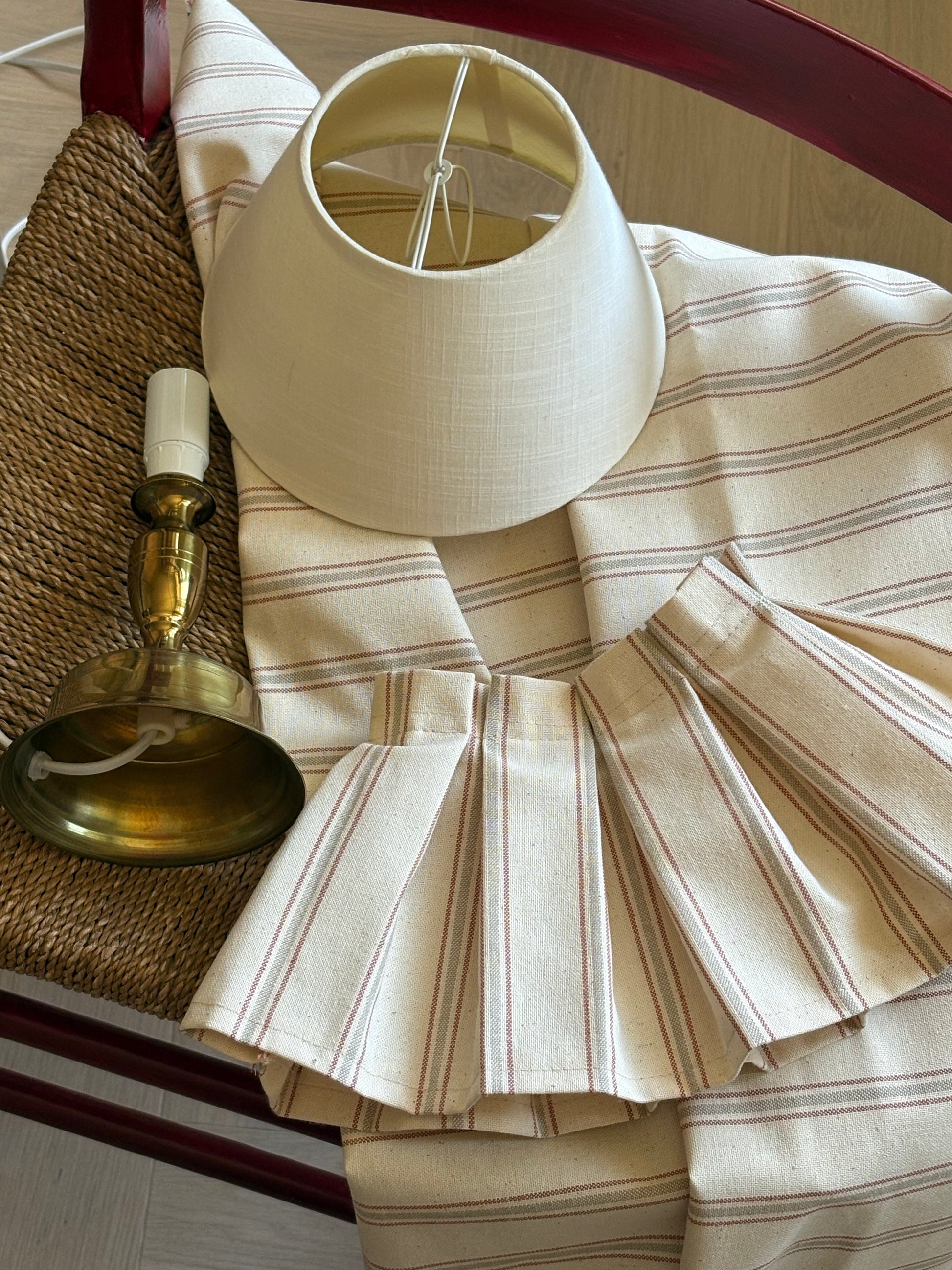 Lampeskjermen er sydd i Vesle studio tilpasset skjermen til lampen. Trekket er ubleket bomullkanvas. Skjørtet kan tas av og på.