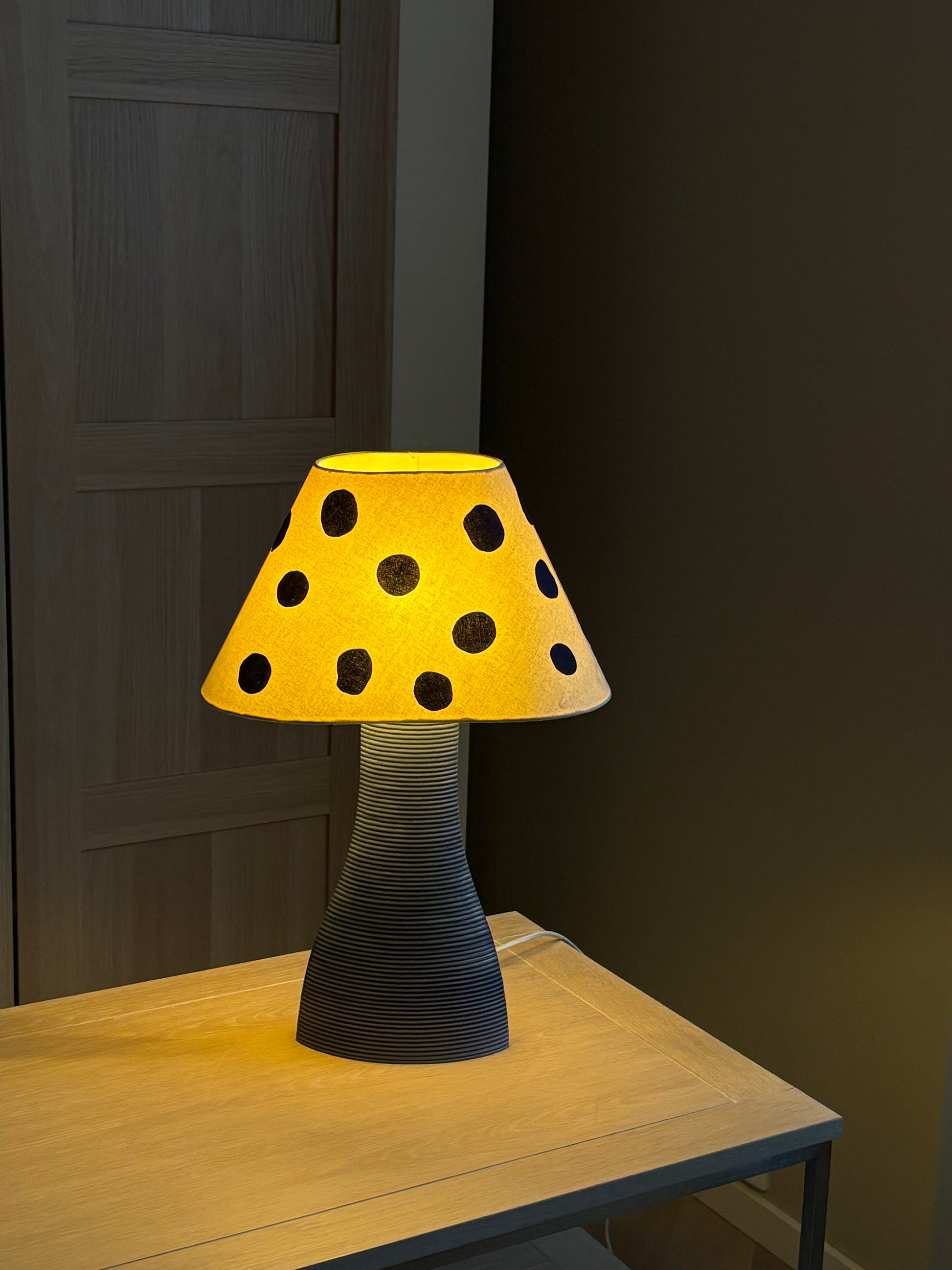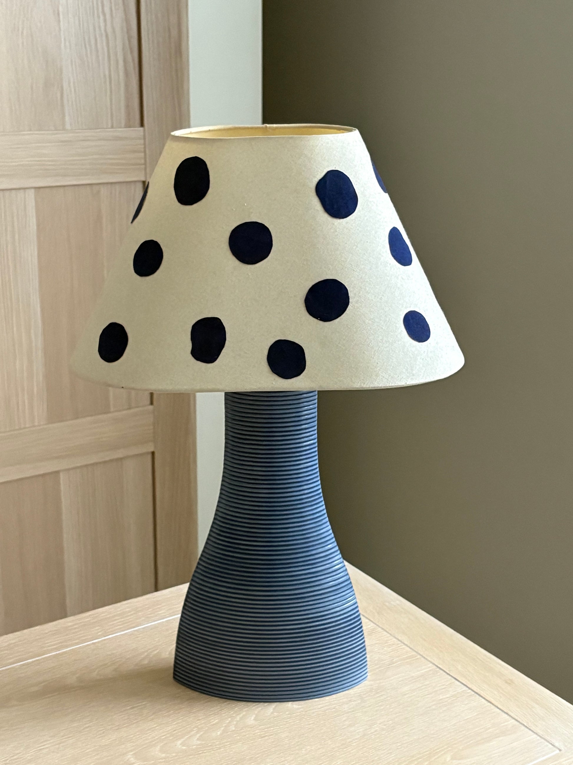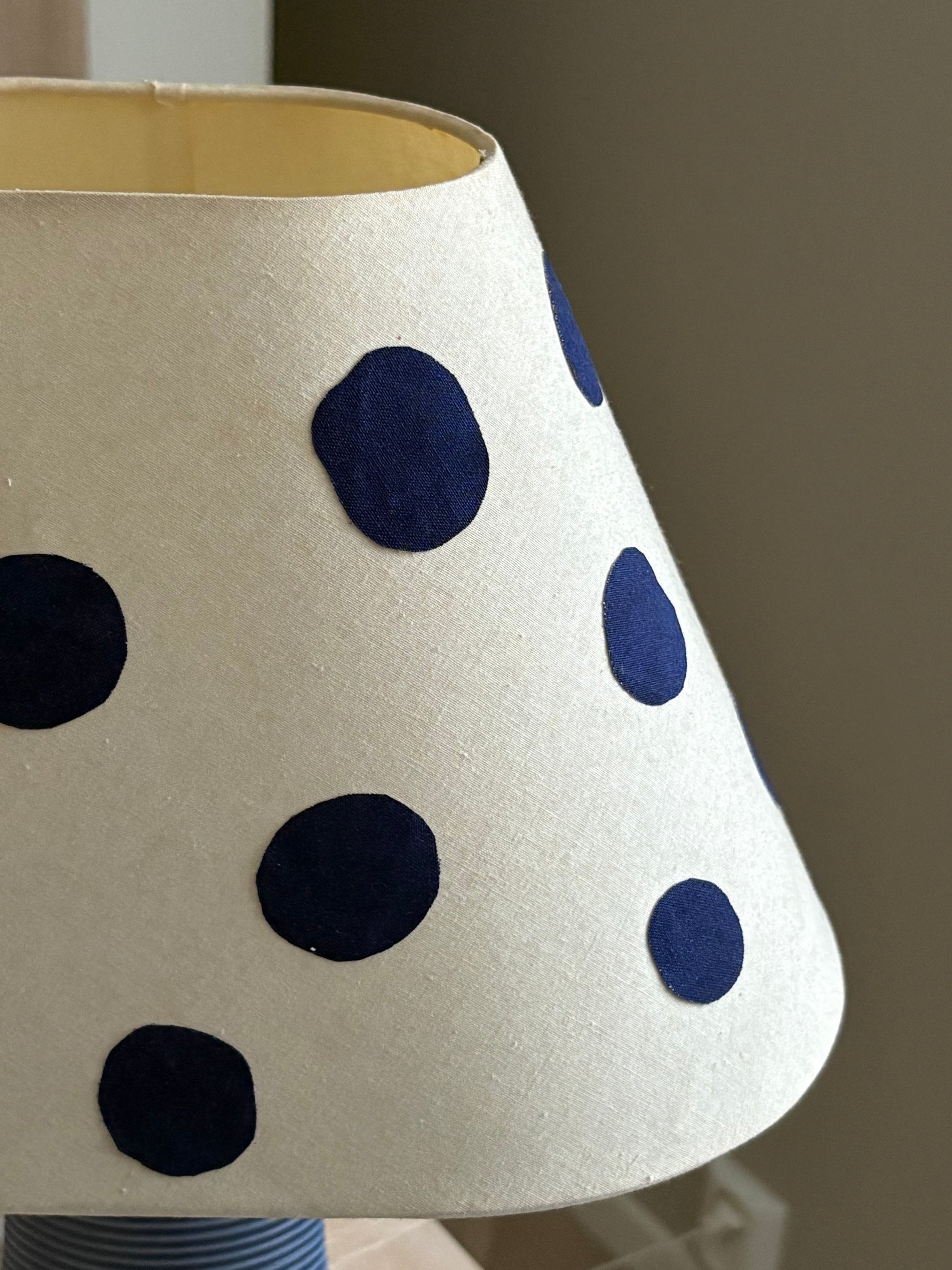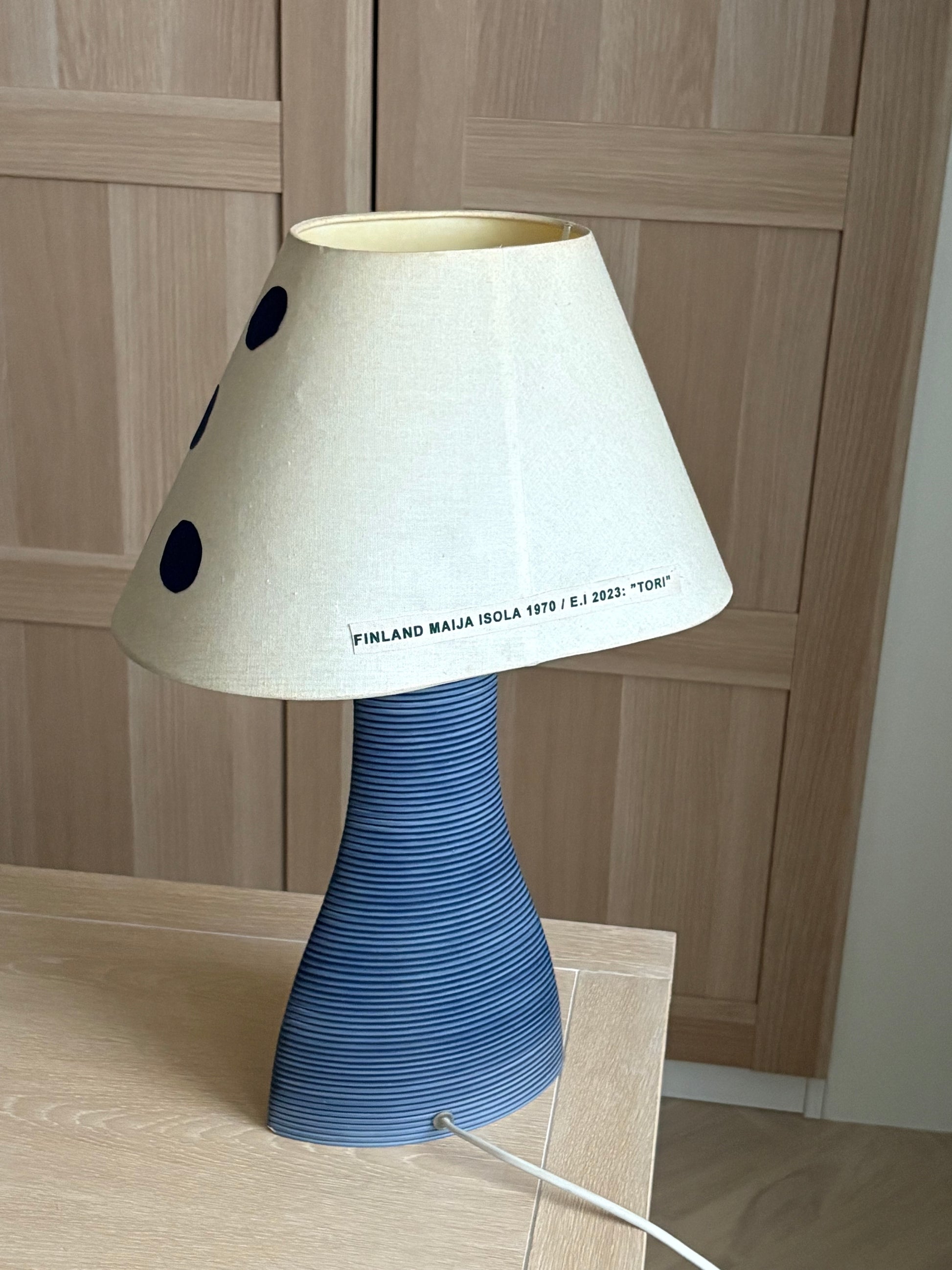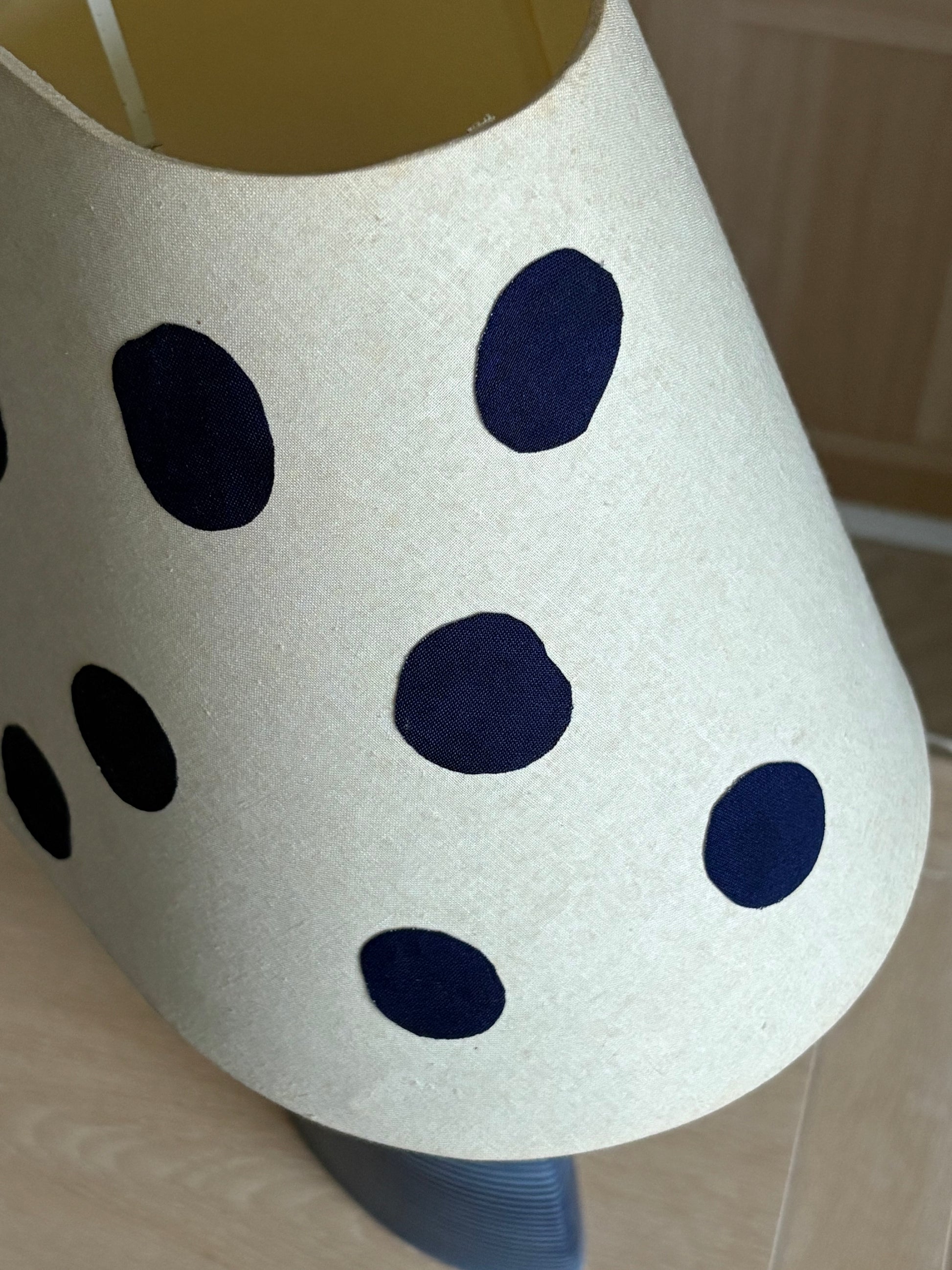 Vesle dot er et gøy og nytt prosjekt! Den fine keramikklampen har fått en skjerm med utskjæringer fra et overskuddstekstil fra Marimekko. Krediteringen til stoffet er festet på baksiden. 💙