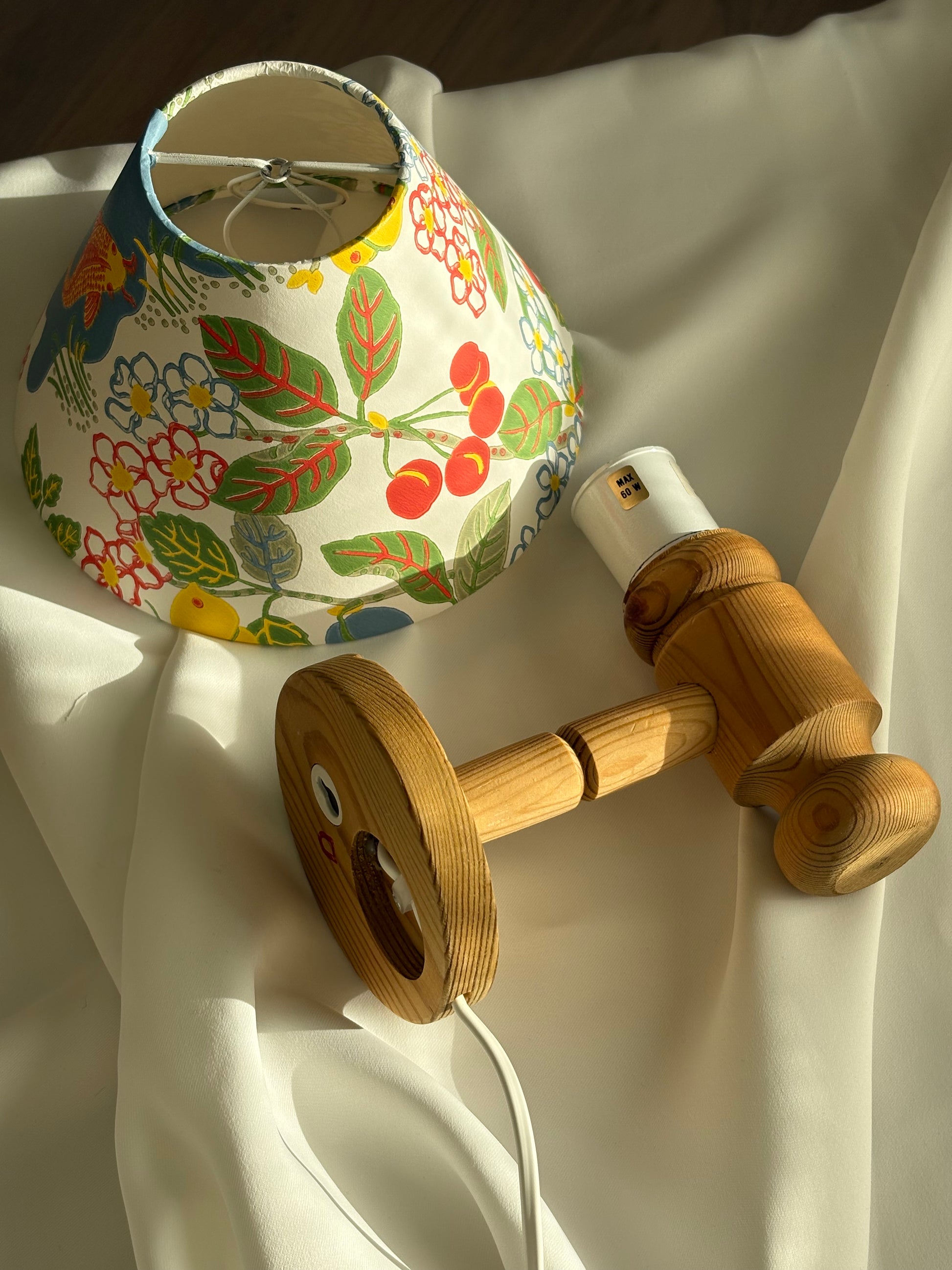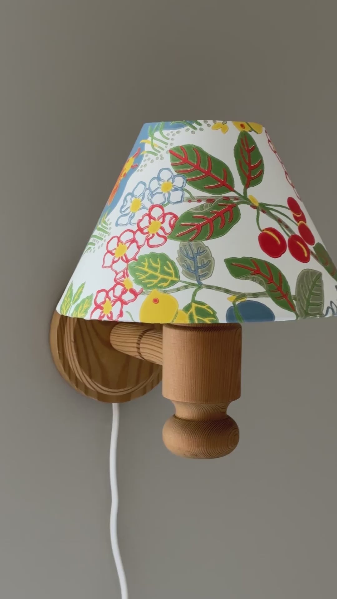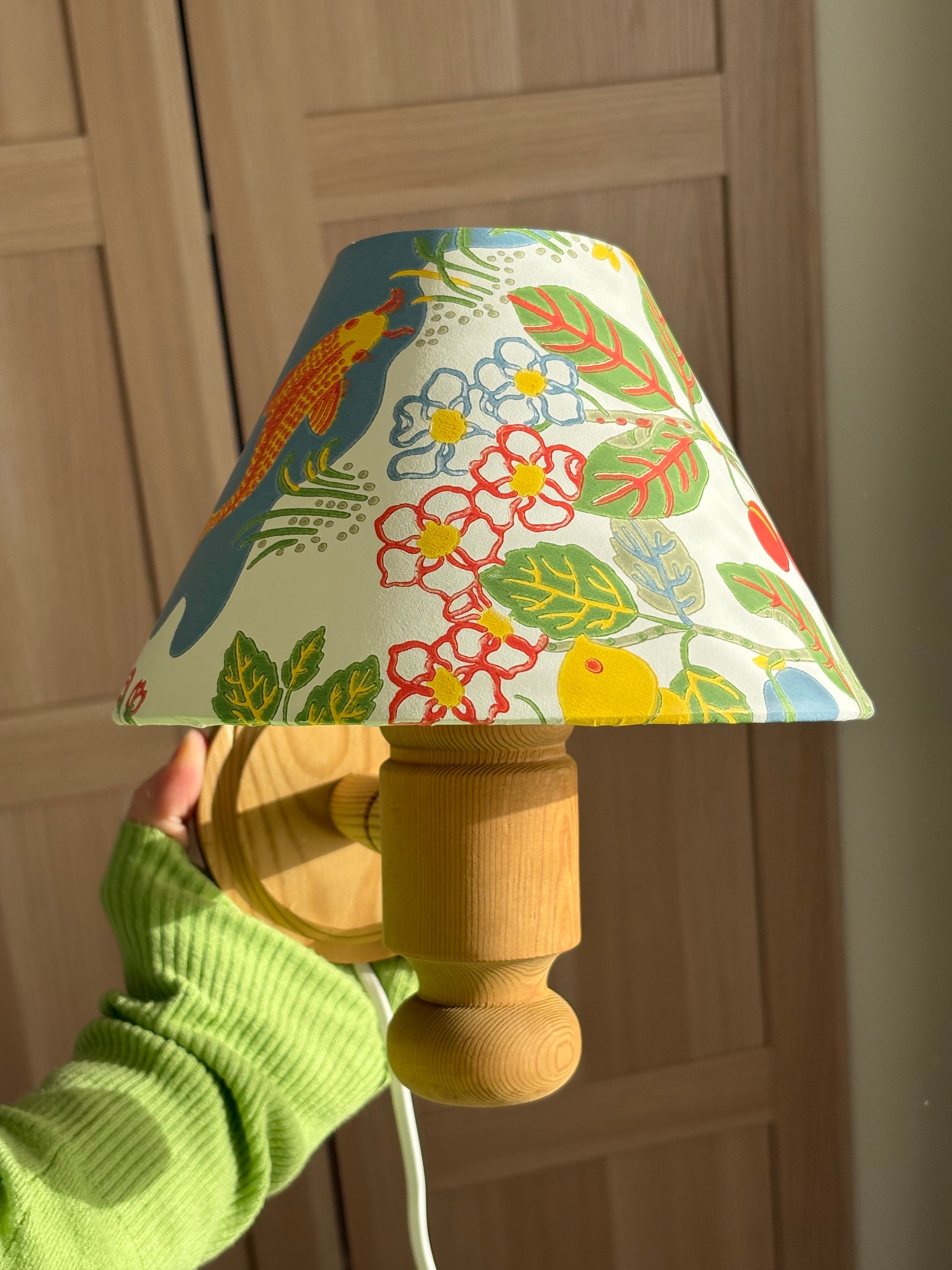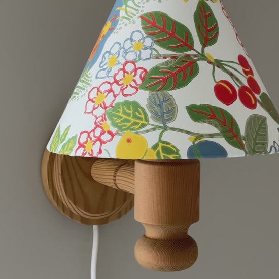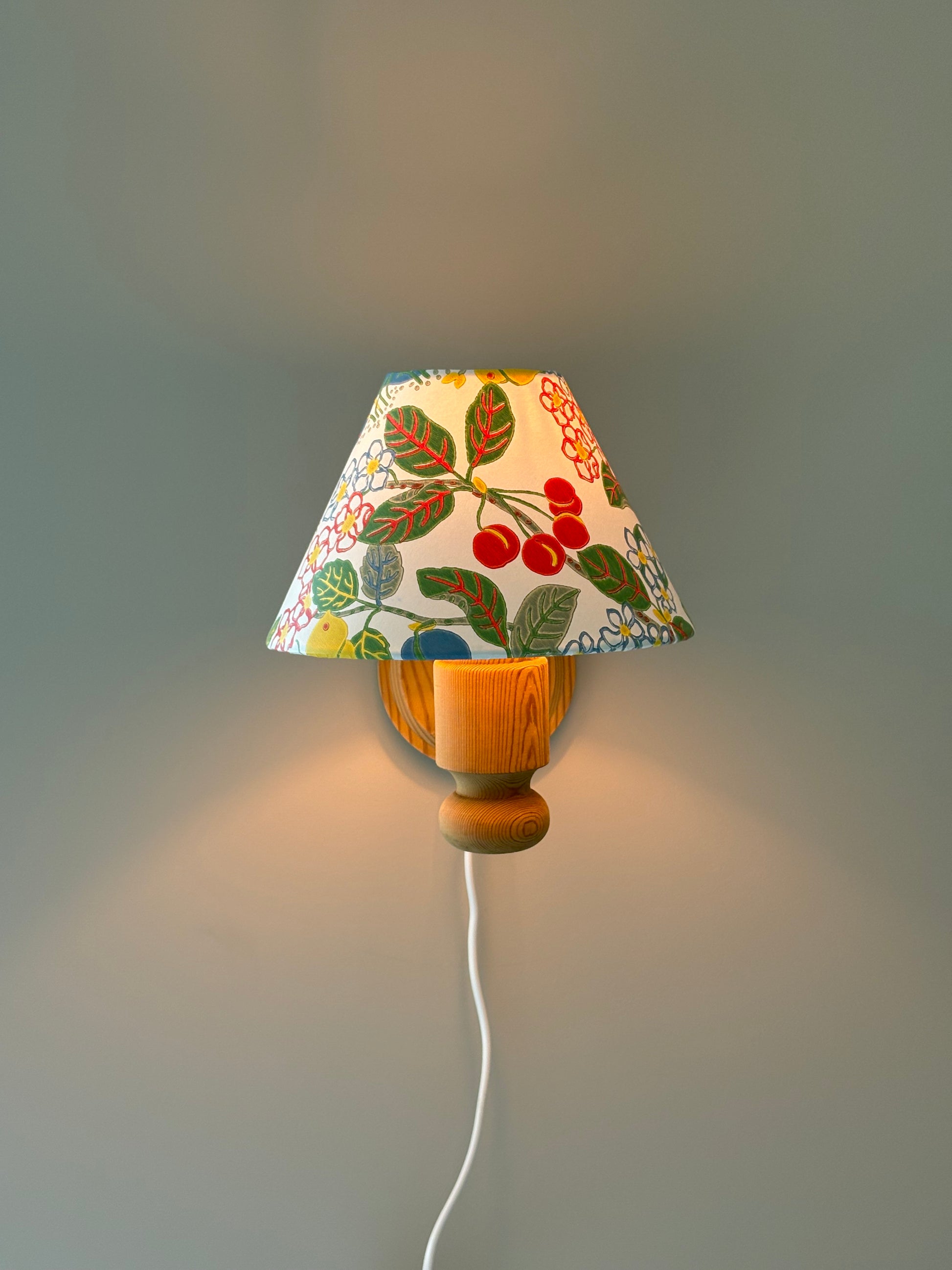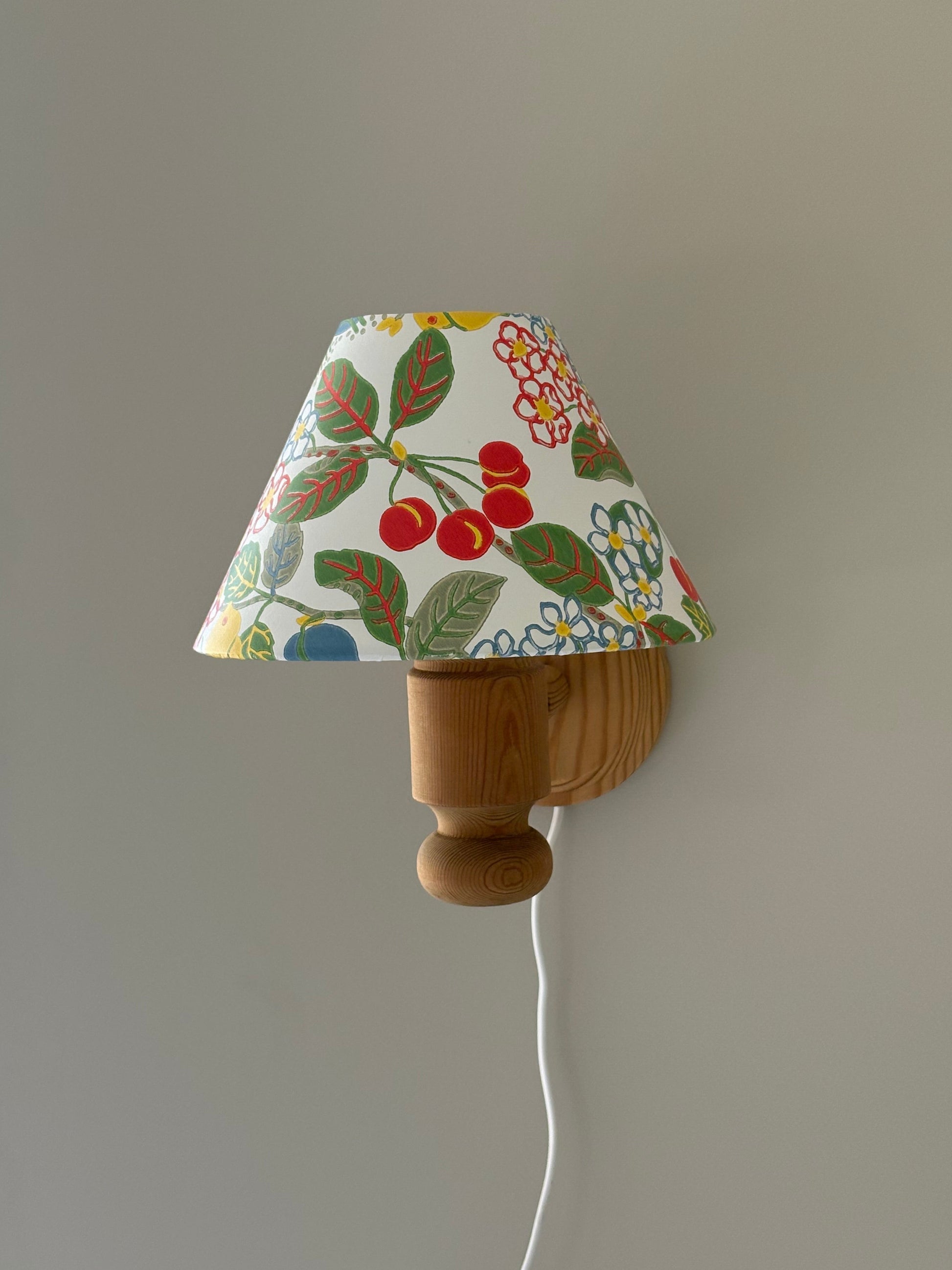 Herlig vintage vegglampe i ubehandlet furu. Med en omtrukket skjerm i Svenskt Tenn tapeten Paradiset.