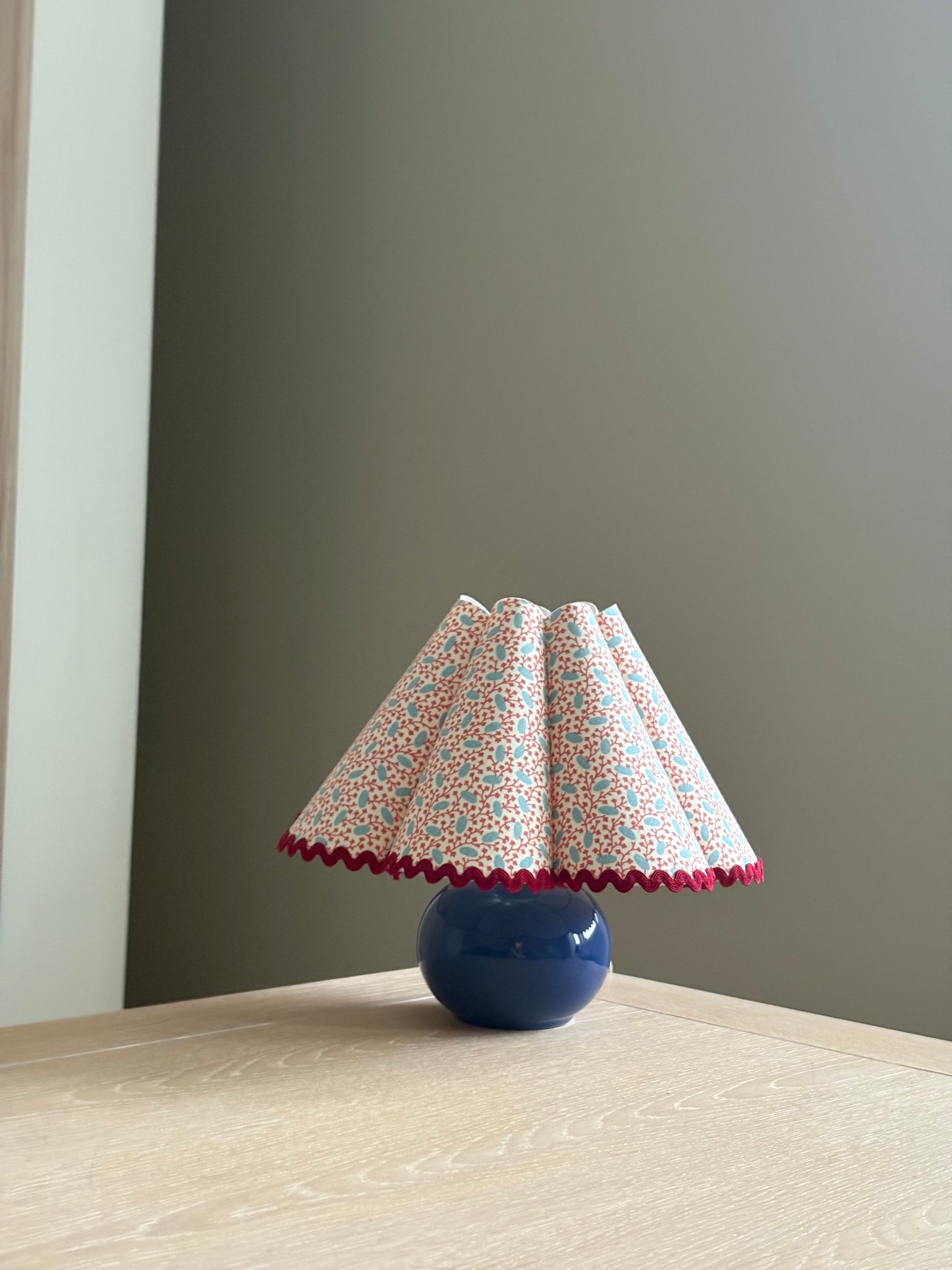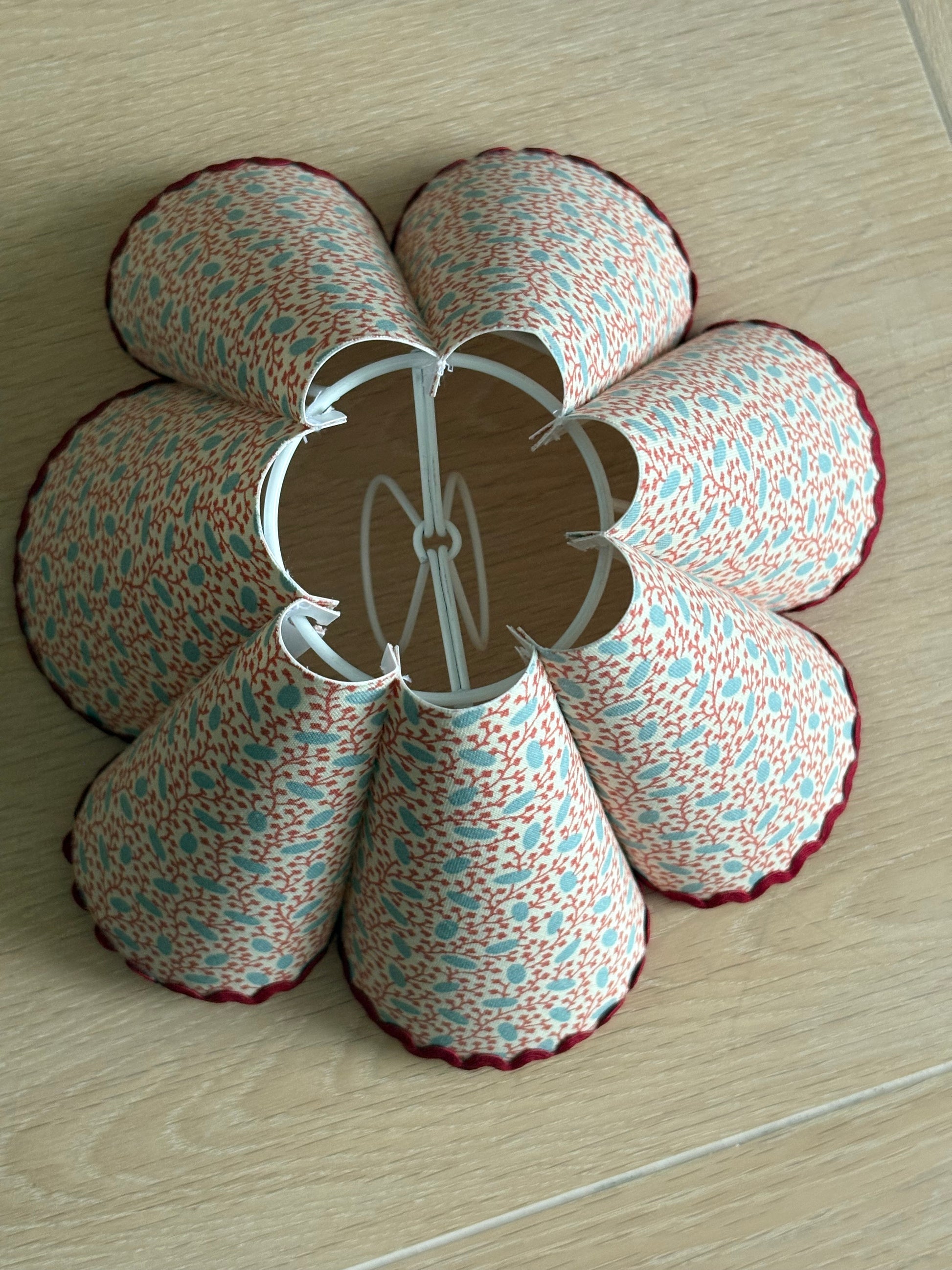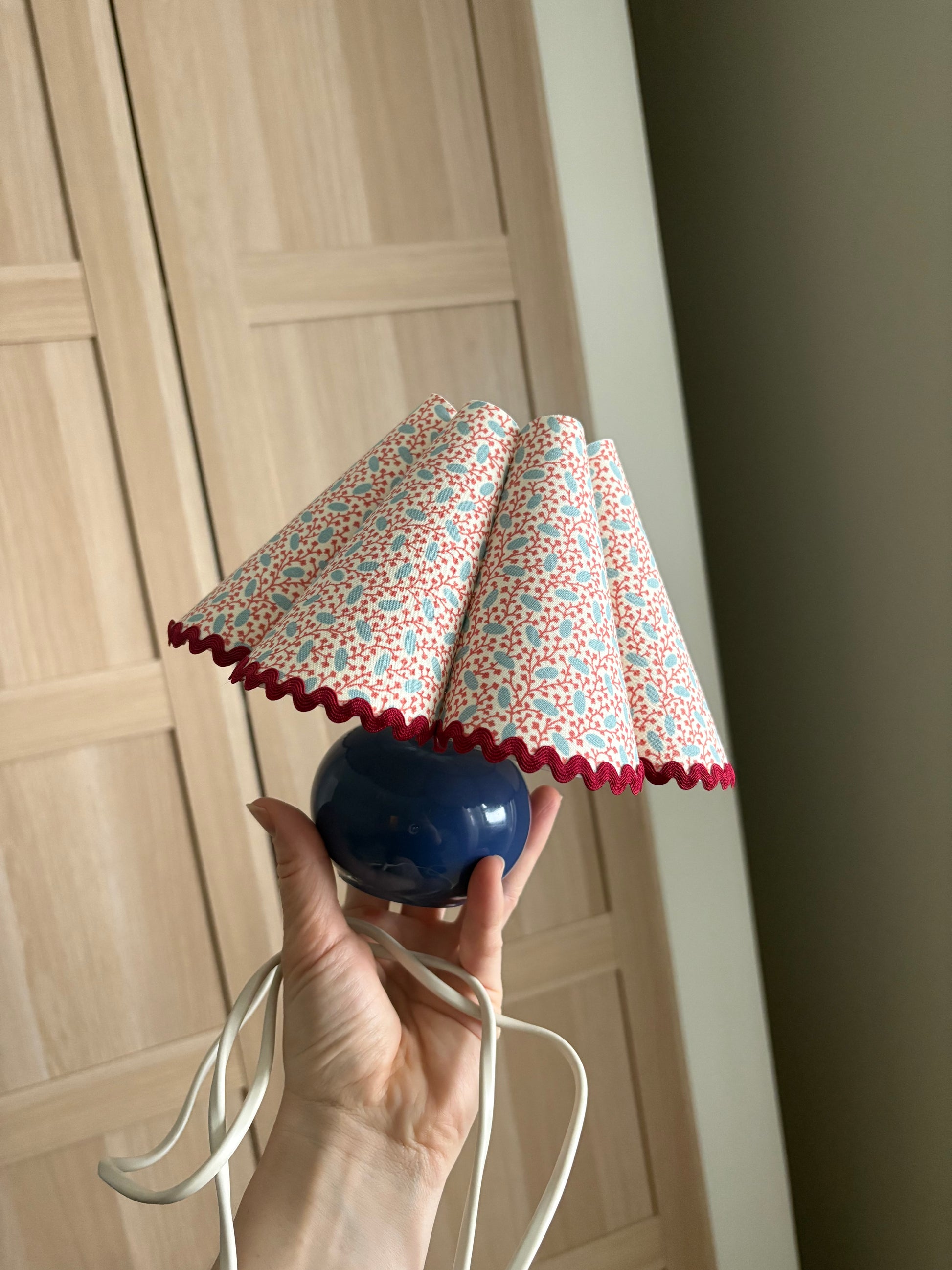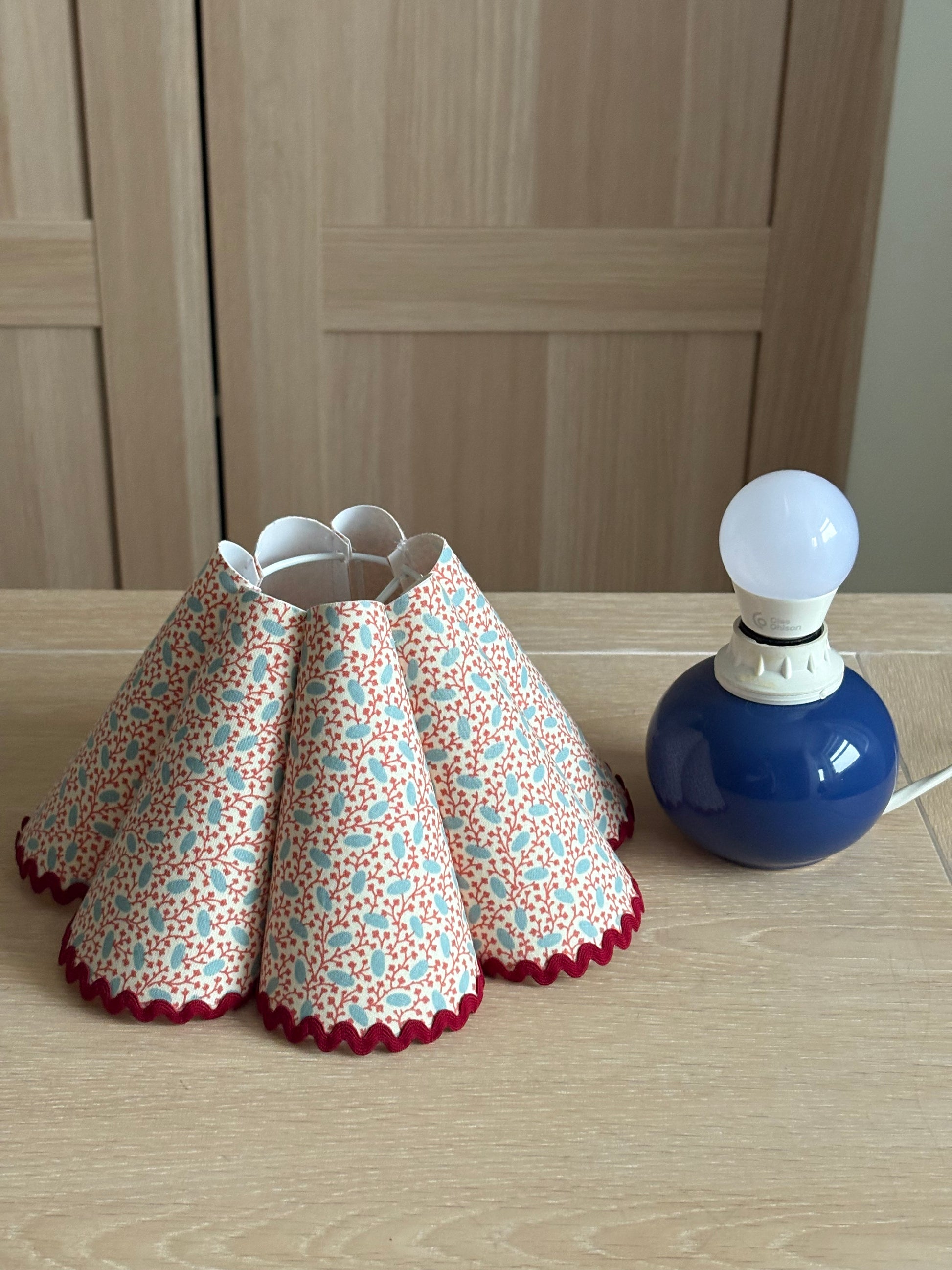 Lampeskjermen er laget med restestoff fra britiske Ian Sanderson og rødt kroklissebånd. Lampeskjermen kan ha ujevnheter da den er håndlaget. Stativet er gjenbruk fra en gammel skjerm.